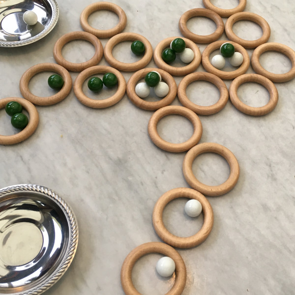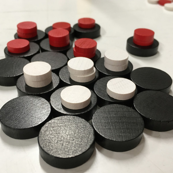 und in vier Farben jeweils 20 Murmeln oder kleine Spielsteine mit einem Durchmesser von ca.14mm