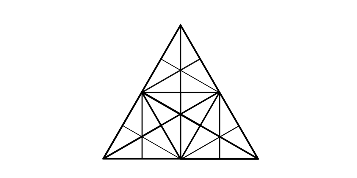 consists of four triangles each with seven points which are connected by lines (three corner points, three median points and one middle point). The game figures stand on the points.The four triangles are arranged as a big triangle.