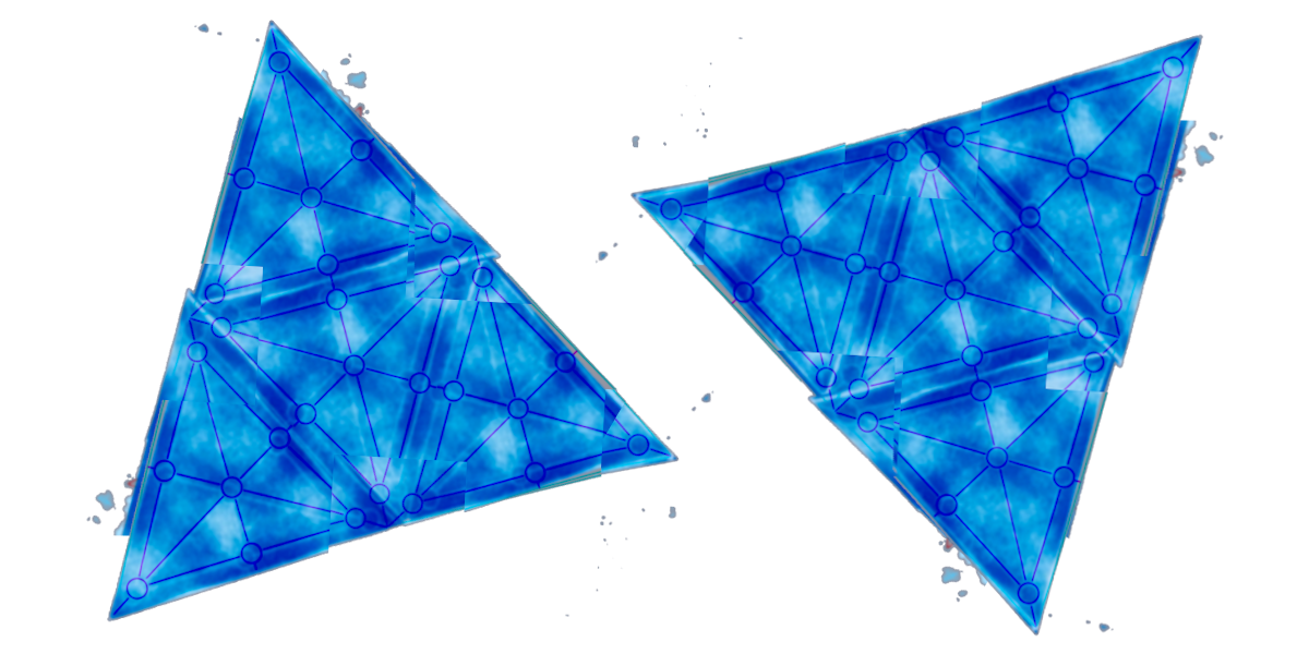 consists of four triangles each with seven points which are connected by lines (three corner points, three median points and one middle point). The game figures stand on the points.The four triangles are arranged as a big triangle. It is possible to leave and enter the game board at the corner points of each triangle. If a figure leaves the board from a corner point of the big triangle it enters again on one of the other corner points of the big triangle or on one point of the opponing constellation of three corner points. If a figure leaves the board from one point of the constellation of three corner points it enters again at one point of the other constellations of three corner points or on the opponing corner point of the big triangle.